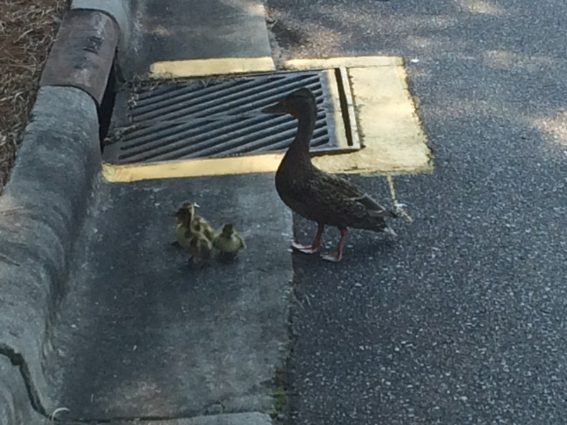 The Policeman finally showed up, and we went looking for the mother duck and the other three ducklings. They could’ve been in the woods or near one of the storm drains. We finally spotted them in the pond across the street.