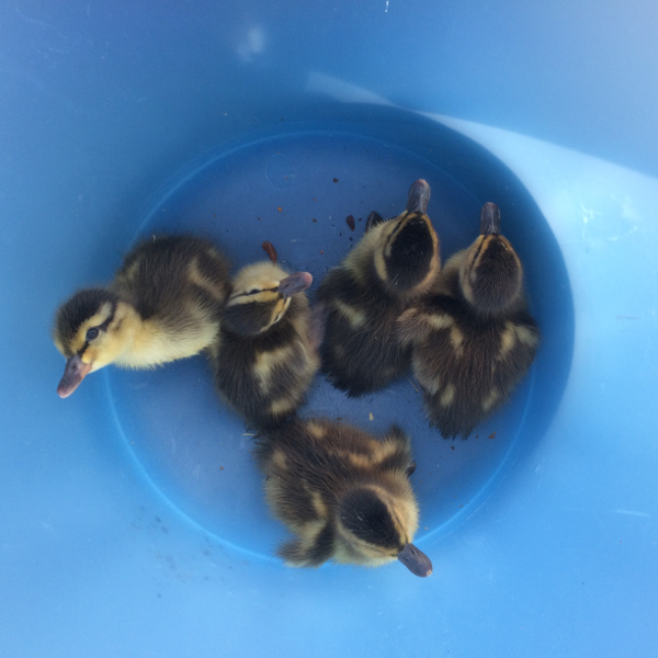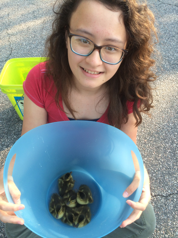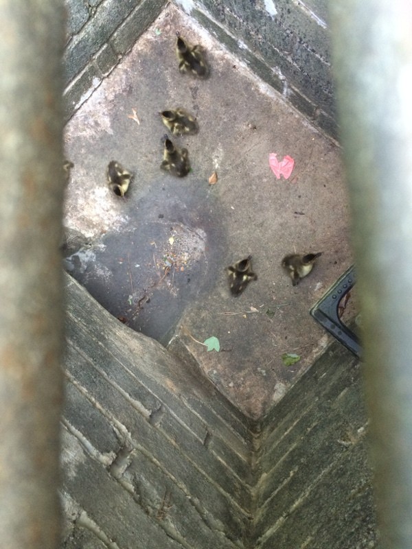 They were standing pretty close to a storm drain. Then a car came whizzing by and one of the ducklings jumped into the storm drain! I went over to the storm drain and found six ducklings at the bottom!