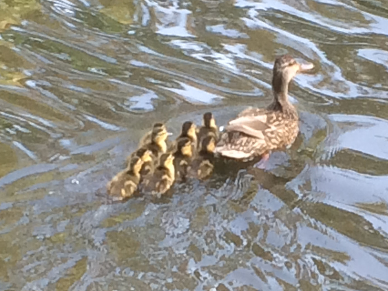 So we carried our bucket to the pond. When we got close, the mother heard the ducklings cheeping and she ran over to us. Sydney laid the bucket down sideways in the grass and we all backed away. The mother duck ran to us, quacking like crazy, and all of the ducklings started cheeping even louder. The mother went to the bucket and then escorted them all down the grass and into the pond. And then they swam away in a tight formation, all nine babies clinging closely behind the mother.